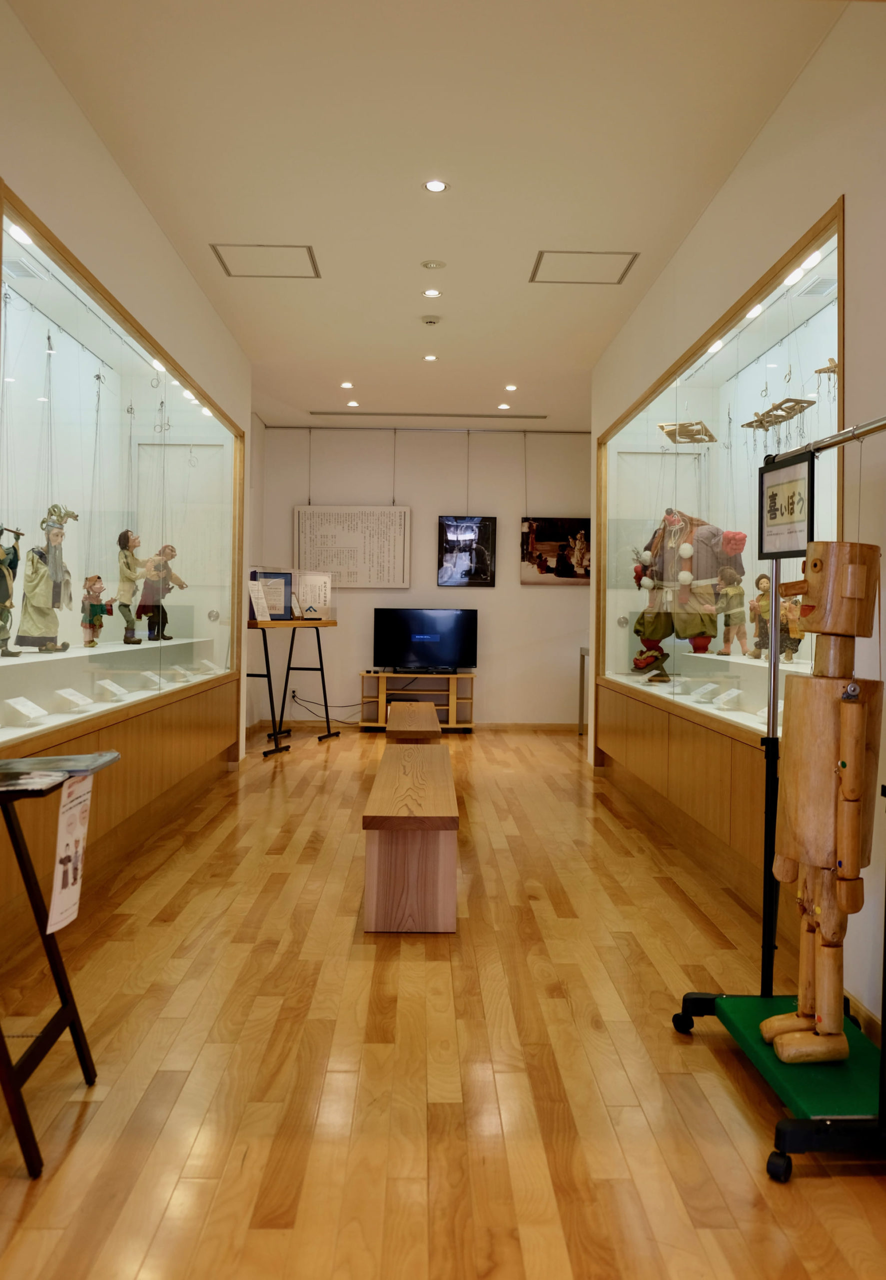Jouxtant la bibliothèque, dans la galerie d’exposition, on admire les marionnettes de Taketa Kinesuke, dont la fameuse petite Yukinko. La « 集いの部屋 », (tsudoi no heya), la salle de « rassemblement » est d’ordinaire une grande salle de travail mais c’est une salle polyvalente où l’on peut même monter des spectacles de marionnettes grâce à une scène dédiée. Dans le couloir, un grand moulage des amas coquilliers datant de la période Yayoi, découverts non loin de là en 1933, sont fixés au mur.